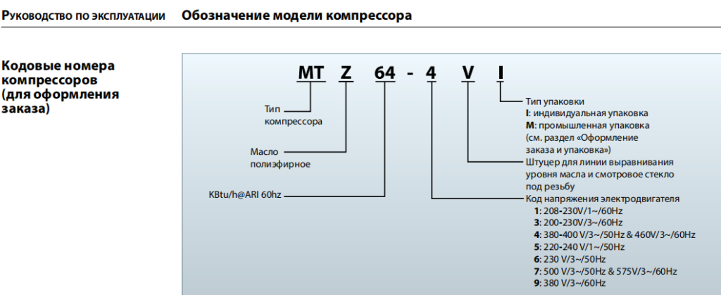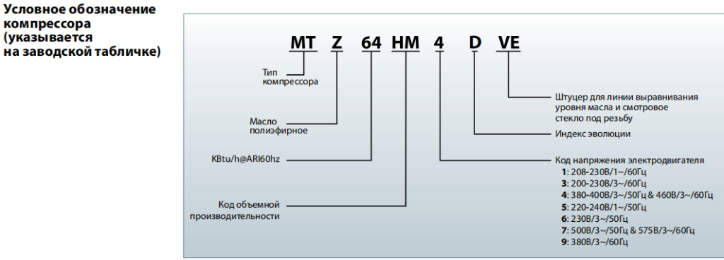Встречаются такие маркировки компрессоров: MTZ72 4VI, MTZ72-4VI, MTZ724VI, MTZ72-6VM, MTZ72HN4BVE, MTZ72 4VI M, MTZ72-4M, MTZ72-5M, MTZ72-5VM, MTZ72-4VI M, MTZ72-4VM, MTZ72-6M, MTZ72HN4AVE, MTZ72HN4BVE, MTZ72HN4CVE, MTZ72HN4DVE.